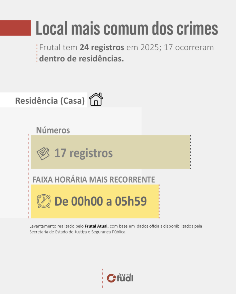 Outro dado que chama atenção é o local das ocorrências. Segundo o levantamento, 17 dos 24 crimes foram registrados em residências, o que reforça um padrão de violência praticada no ambiente doméstico ou familiar — contexto frequentemente associado à subnotificação e à dificuldade de denúncia.