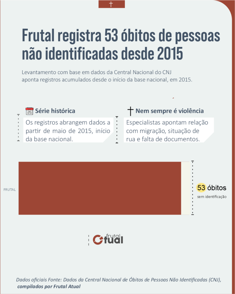 O levantamento, feito pela redação de Frutal Atual, considera apenas ocorrências registradas no município de Frutal, independentemente de dados estaduais ou nacionais. Os óbitos classificados como “não identificados” são aqueles em que a pessoa faleceu sem documentação ou sem que fosse possível confirmar oficialmente sua identidade no momento do registro. Nessas situações, o sepultamento é realizado com base nas informações disponíveis, ficando o registro aberto para eventual reconhecimento futuro.