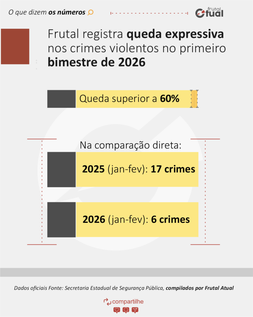 Levantamento oficial dos crimes violentos registrados em Frutal aponta queda significativa no comparativo entre os dois primeiros meses de 2025 e 2026.