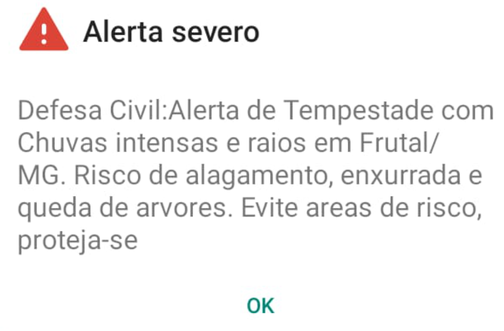 A população de Frutal recebeu na tarde desta terça-feira, dia 09, um alerta severo de tempestade emitido pela Defesa Civil por meio do sistema de avisos enviado diretamente aos celulares.