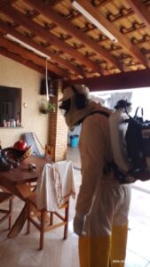 Durante esse trabalho, é realizada a aplicação de inseticida dentro das residências e nos arredores, além da vistoria para identificar possíveis criadouros do mosquito transmissor.