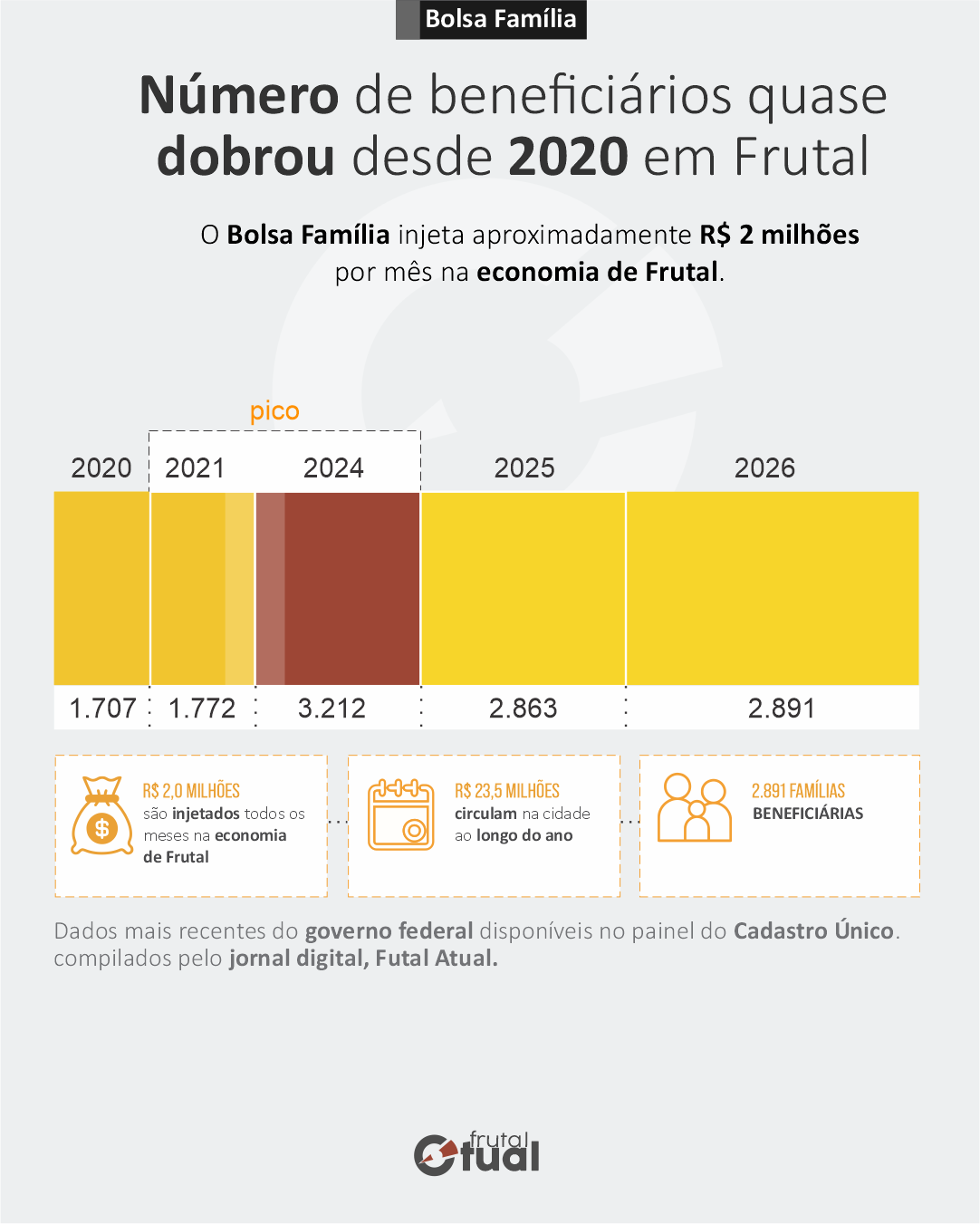 Com base no valor médio nacional do benefício, estimado em cerca de R$ 680 por família, o Bolsa Família injeta aproximadamente R$ 2 milhões por mês na economia de Frutal. Em um ano, o volume pode ultrapassar R$ 23 milhões, considerando os repasses contínuos ao longo dos 12 meses.