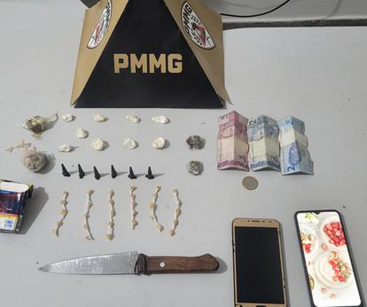 Na abordagem, foram apreendidos dinheiro, drogas diversas, uma faca e dois aparelhos celulares. Um dos celulares, segundo a polícia, era produto de furto.